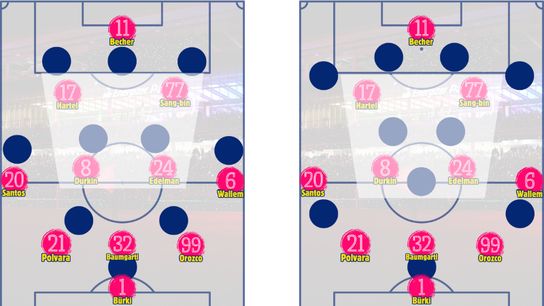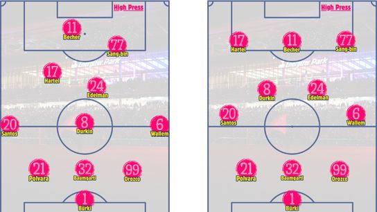 SBJ & Joyner will be expected to cut inside and stretch lines, working off passes from Hartel and Becher & getting onto whipped crosses from Wallem & Santos. Both can also shift to a two-striker formation up top alongside Becher, with Hartel working even more centrally.